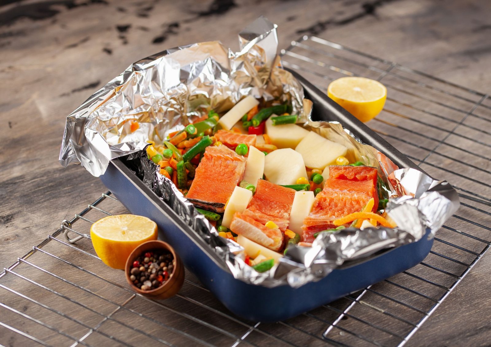 5. Cierra los paquetes: Dobla el papel de aluminio alrededor del pescado y las verduras, sellando los bordes para formar paquetes bien cerrados. Asegúrate de que estén bien sellados para que no se escape el vapor durante la cocción.